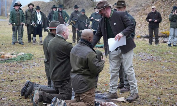 Deutsch-amerikanische Jägerfreundschaft: Feierlicher Jägerschlag für US-Kursteilnehmer mit besonderem Rahmen und starken Zeichen der Verbundenheit.