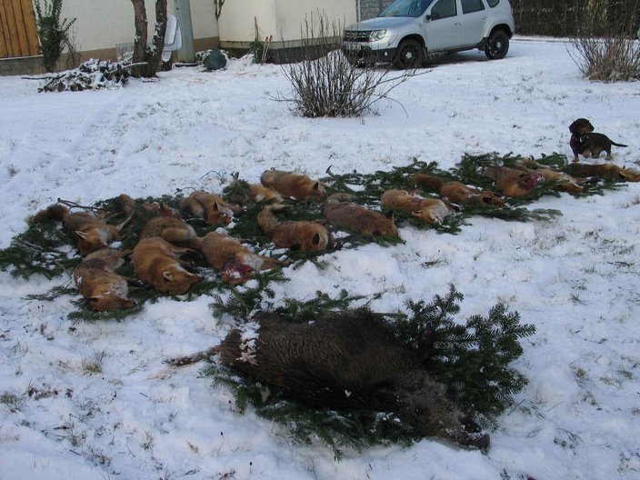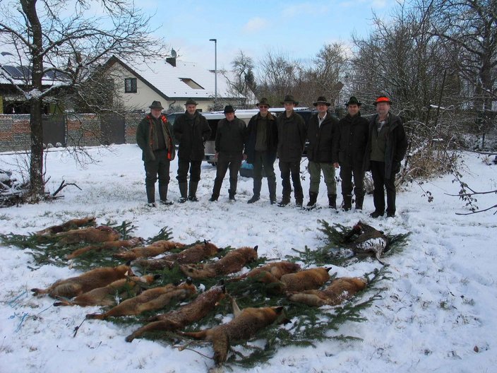 Da auch im Oberen Gäu seit letztem Jahr die Staupe und Räude den Fuchsbestand dezimierte, fiel die Fuchsstrecke diesmal entsprechend kleiner aus als in den Vorjahren. Es wurden bei Bau- und Ansitzjagd insgesamt 21 Füchse erlegt, die am Sonntag, 15. Januar 2017 auf der Baumwiese hinter der Gaststätte „Sonne“ in Tailfingen zur Strecke gelegt und verblasen wurden, bevor es zum gemeinsamen Frühschoppen überging.