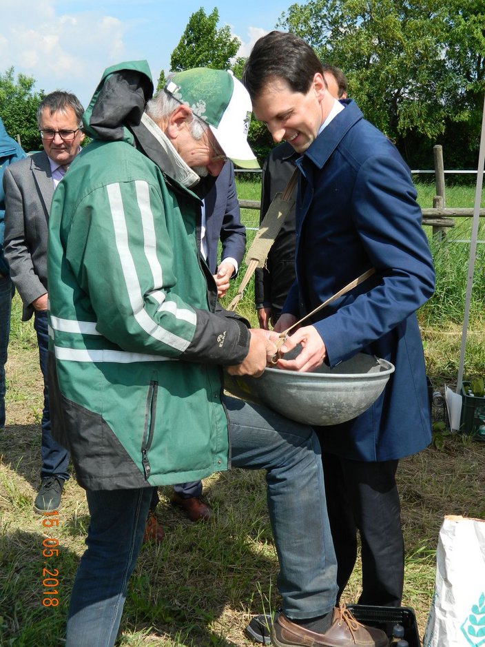 Vize-Landrat Martin Wuttke sät auf den Flächen des Landwirtes Helmut Kayser (Wildbiologe u. Berater für Biotop Hege, Natur- u. Tierschutzfragen bei der KJV BB) eine für Rebhühner leckere Pflanzenmischung aus.