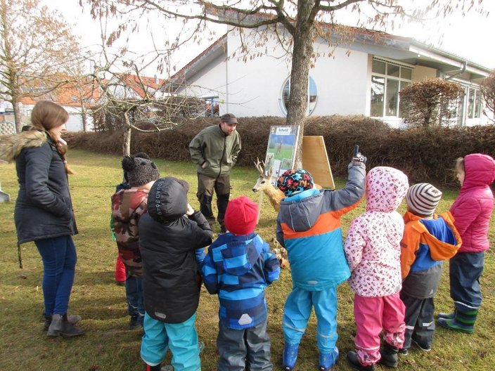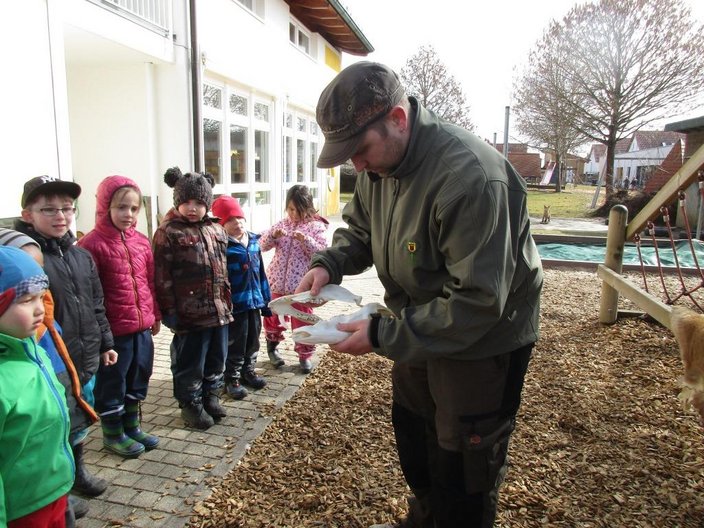 Lernort Natur Obmann der Jägervereinigung Böblingen, Bastian Holzner, besuchte die Kinder der Gruppe „Suns“ mit ihren Erzieherinnen als Abschluss des achtwöchigen Projektes „Heimische Waldtiere im Winter“. Der Garten des Kindergartens ähnelte an diesem Vormittag eher dem heimischen Wald – überall waren Informationstafeln zu sehen, auch ein Hirschgeweih, ein Wildschweinfell und verschiedene Tierpräparate machten den Garten zum Lernort hautnah. „Der Hirsch ist gar nicht der Mann vom Reh“ erklärt der sechsjährige Lian stolz „ und sein Geweih fällt nicht gleichzeitig ab, sondern jede Seite nacheinander“ weiß Ines, 5 Jahre, hinzuzufügen. Ob Rehwild, Rotwild, Rotfuchs, Dachs oder Wildschwein - es blieb keine Frage offen. Mit einer gekonnten Mischung aus neuen Informationen, Fragen, Spielen und hautnah Erlebtem überraschte Herr Holzner die 25 Kinder immer wieder aufs Neue. Das große Vorwissen der Kindergartenkinder wurde durch Nachfragen und kleine Spiele eingebunden. Kein Wunder also, dass die Kinder mit Eifer bei der Sache waren. Auch das Thema Jagd und deren Notwendigkeit brachte Herr Holzner den Kindern auf kindgerechte Weise näher