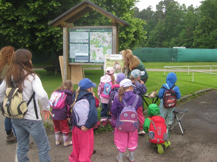 Das Lernort-Natur-Team zu Besuch in Deckenpronn bei der Waldwoche des Kindergarten Mozartstraße.