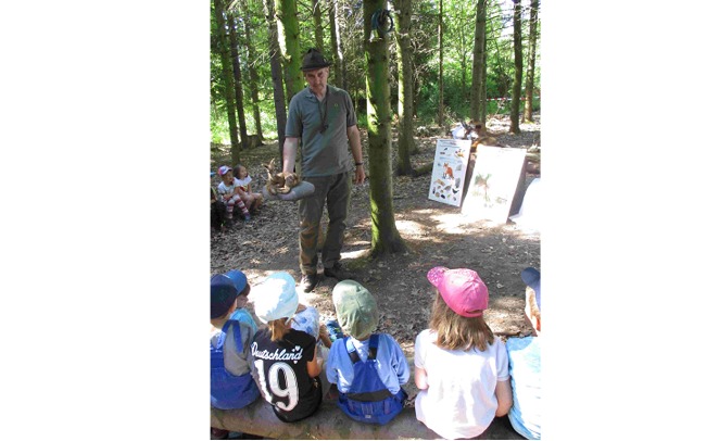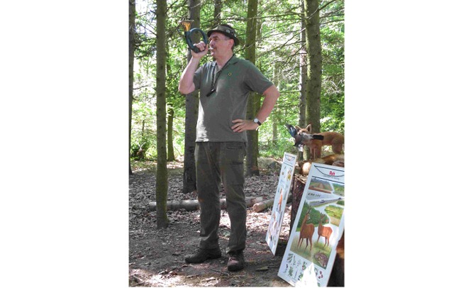 Das besondere Highlight dieser Waldwoche war der Besuch von Herrn Hartmut Egeler mit seinem Jagdhund Joschi von der Kreisjägervereinigung Böblingen. Die Kinder wurden mit einem Jagdhorn-Ruf begrüßt. Er brachte viele Anschauungsmaterialien zum Anfassen mit. Hierzu zählen: