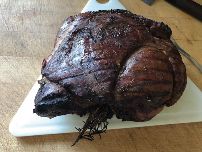 Während die Briketts durchglühen, die entbeinte Keule vorbereiten: Frische Rosmarinstengel, drei ganze Knoblauchzehen, Wacholderbeeren und einige Blätter Salbei in die Keule einlegen. Das Fleisch mit etwas Öl einreiben und dann von allen Seiten auf der glühenden Kohle kurz anbraten, damit sich die Poren schließen. Danach auf die andere Hälfte des Grills legen. Deckel aufsetzen und die Belüftungslöcher fast komplett schließen.