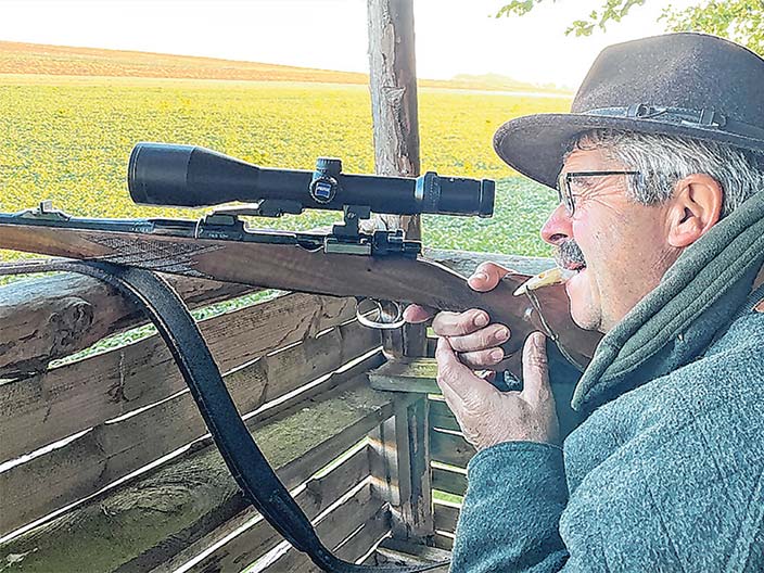 Bei der Blattjagd imitiert der ehemalige Magstadter Bürgermeister Dr. Hans-Ulrich Merz die Laute der Rehgeiß und ihrer Kitze, um den Rehbock anzulocken.