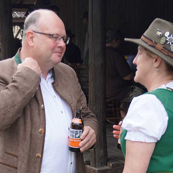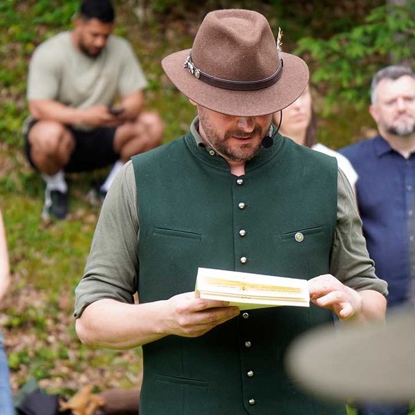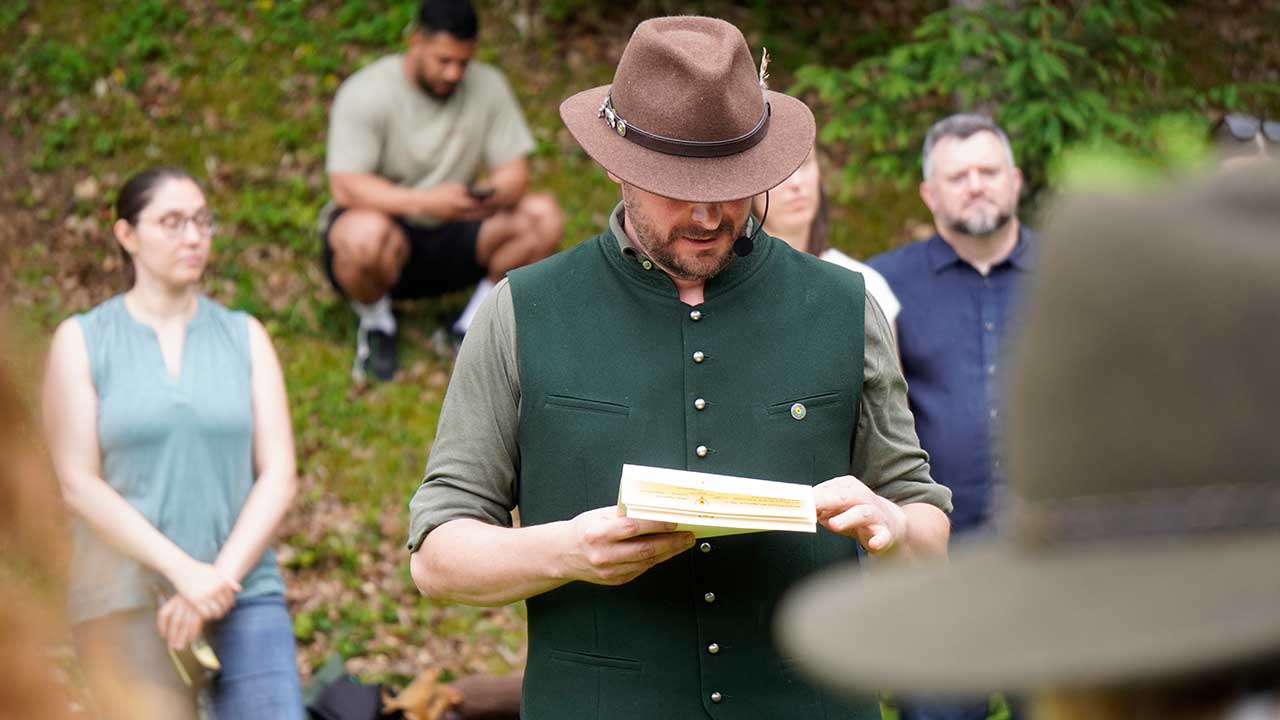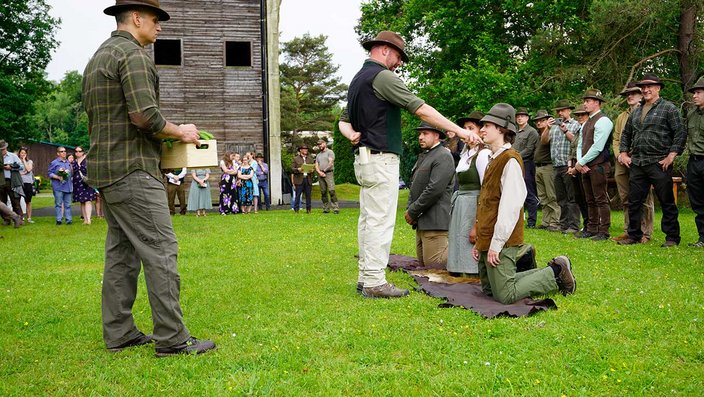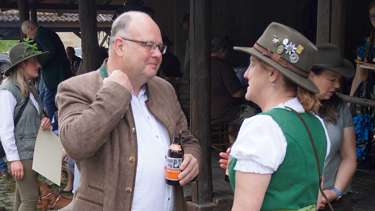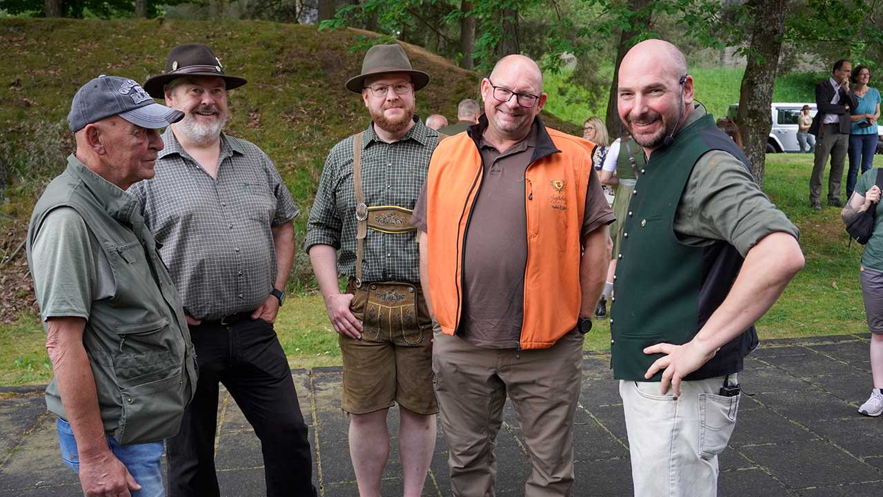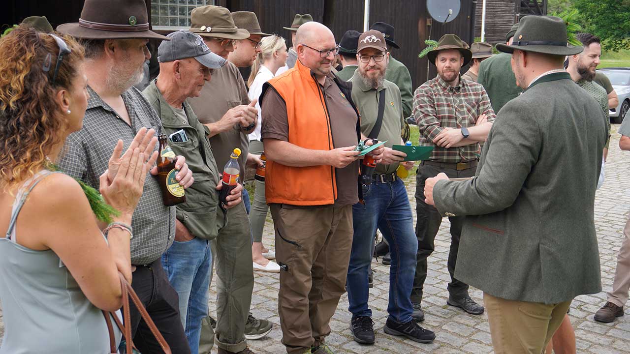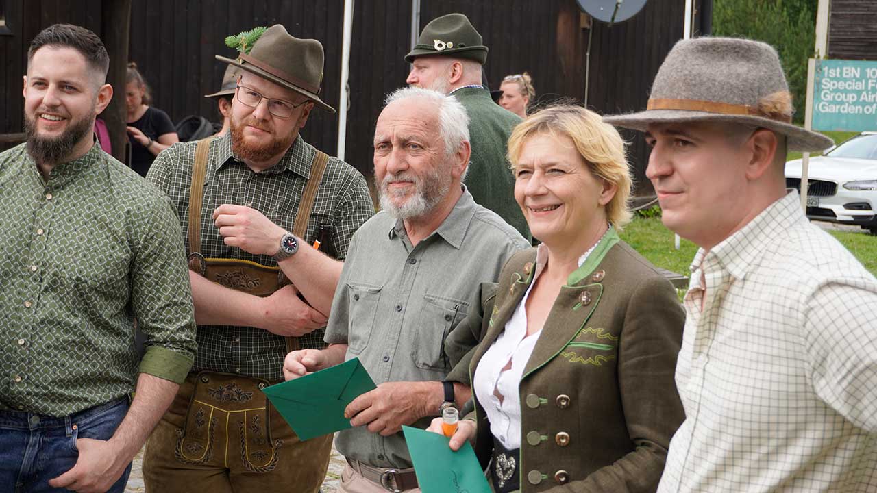 Trotz angekündigtem Regen und Gewitter blieb das Wetter stabil – ein glücklicher Umstand, der den feierlichen Rahmen unter freiem Himmel ermöglichte. Die Zeremonie wurde erstmals von Kreisjägermeister Timo Böckle geleitet, der die neuen Jägerinnen und Jäger mit den traditionellen Worten und dem symbolischen Schlag in die Reihen der Jägerschaft aufnahm. Unterstützt wurde er dabei von Rob Gwinner vom Housing Facilities Support Service (HFSS), der in seiner Ansprache die gewachsene deutsch-amerikanische Freundschaft unter Jägerinnen und Jägern würdigte – enger, so Gwinner, sei die Verbindung zwischen beiden Seiten nie gewesen.